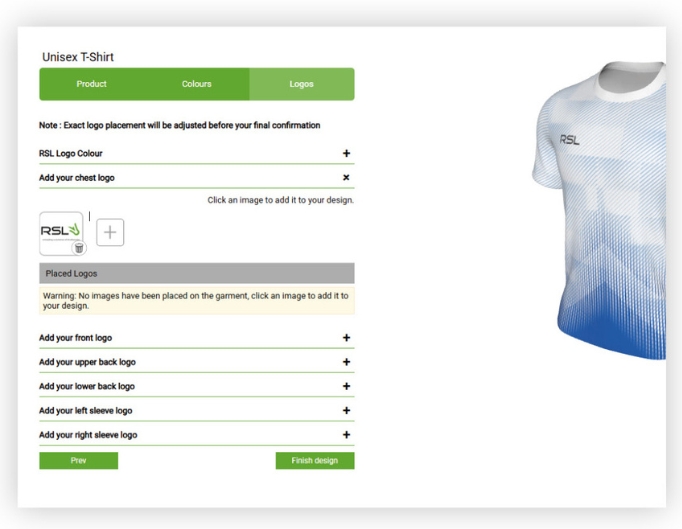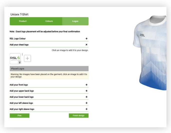 Bemærk, at logoer altid vil blive gennemgået og justeret af RSL for at sikre, at de står korrekt og lige på det endelige produkt. Når du er færdig med at placere logoerne trykkes der på ”Finish design”